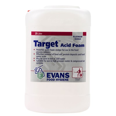 Το TARGET ACID FOAM είναι ένα ισχυρό βαρέως τύπου, όξινο απορρυπαντικό, σχεδιασμένο για χρήση με πλυστικά συστήματα υψηλής πίεσης που φέρουν εξοπλισμό δημιουργίας αφρού ή με συστήματα παραγωγής αφρού με πεπιεσμένο αέρα. Είναι κατάλληλο για τον καθαρισμό δαπέδων, τοίχων, οροφών και κάθε είδους συσκευών ή εξοπλισμού στη βιομηχανία επεξεργασίας κρεάτων καθώς και των οχημάτων μεταφοράς. Είναι ιδιαίτερα αποτελεσματικό σε κάθετες επιφάνειες και συστήνεται για χρήση σε σφαγεία ή εργοστάσια τυποποίησης κρεάτων.